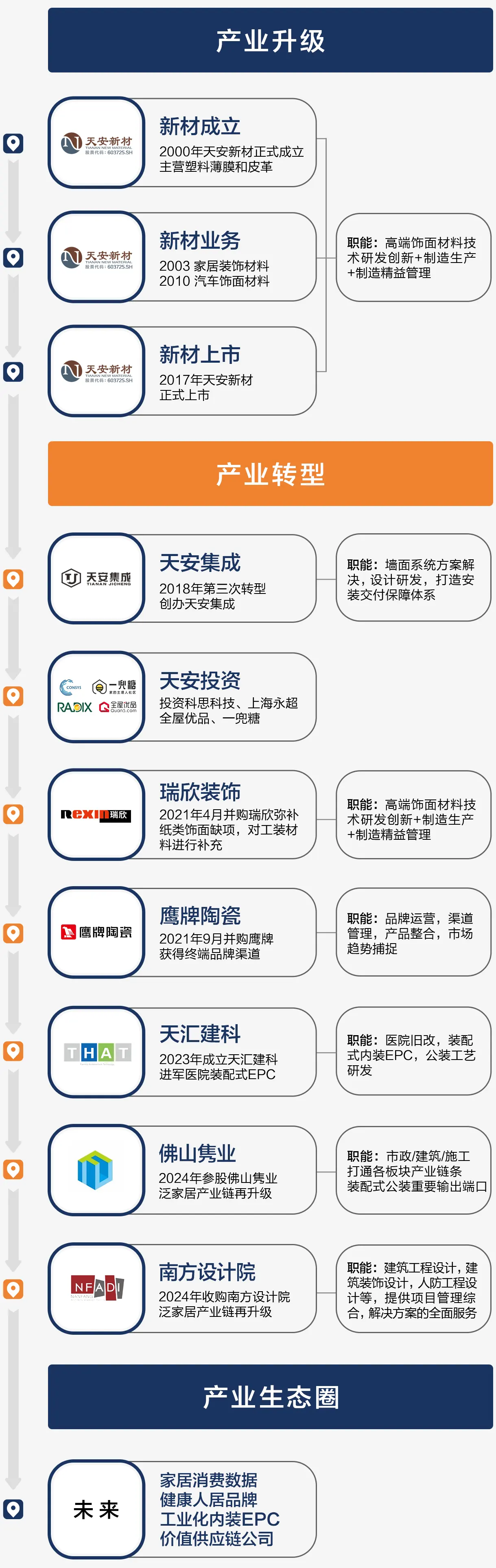 创新是企业发展的源动力,天安新材成功踏入资本市场之后,积极投身于投融资等诸多方面的探索与实践活动。通过收购及投资多家企业的系列运作,有力地推动企业传统产业战略转型升级,为企业大家居战略布局夯实了牢固的发展根基。